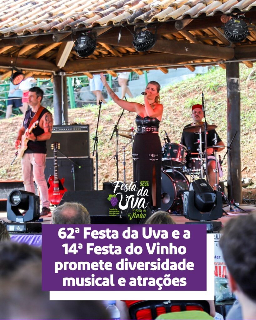 A 62ª Festa da Uva e a 14ª Festa do Vinho de Vinhedo já têm programação musical oficial confirmada. As apresentações serão realizadas nos dias 6, 7, 8, 12, 13, 14, 15, 19, 20, 21 e 22 de março, em diversos palcos instalados no Parque Municipal Jayme Ferragut, reunindo artistas de diferentes estilos e consolidando o evento como um dos principais do calendário cultural do município. A programação foi organizada para garantir entretenimento ao longo de todo o dia, promovendo cultura, lazer e valorização dos artistas locais e regionais.